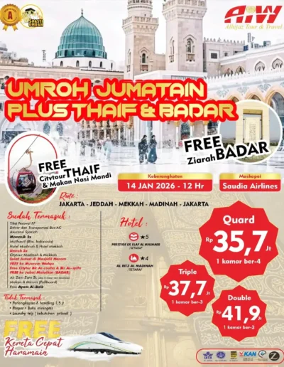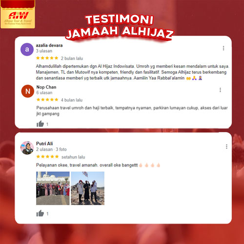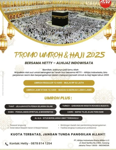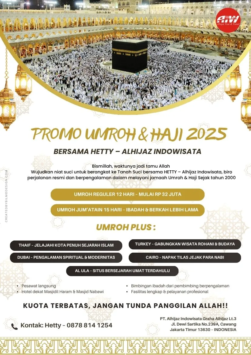 Salam Hangat, Saya Hetty Rohaeti, mengucapkan terima kasih sebesar-besarnya atas waktu Anda mengunjungi website Alhijaz Indowisata. Semoga informasi yang tersedia di sini dapat membantu Anda dalam merencanakan perjalanan ibadah yang nyaman dan berkesan. Untuk komunikasi langsung, silakan tekan tombol Chat di bawah ini, saya siap membantu Anda dengan informasi dan layanan terbaik.